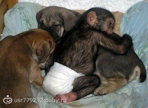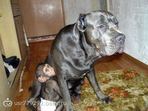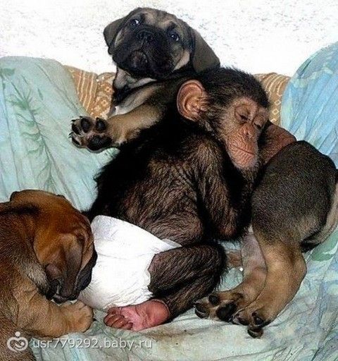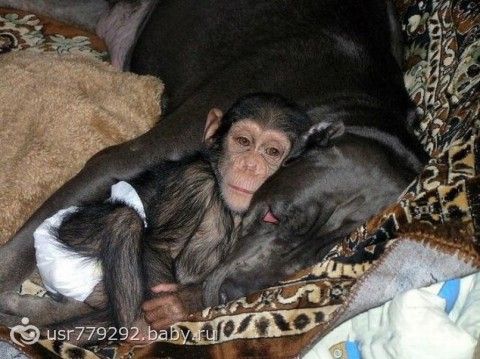 Она ухаживает за ним и растит его, но ее собака породы мастиф похоже считает шимпанзе одним из своих щенков. Да и сам детеныш похоже неплохо осваивается с ролью обезьяньего Маугли...