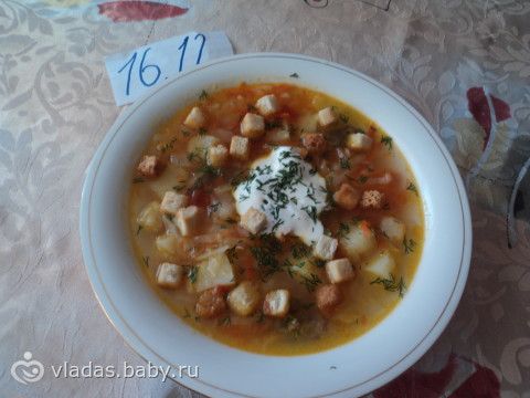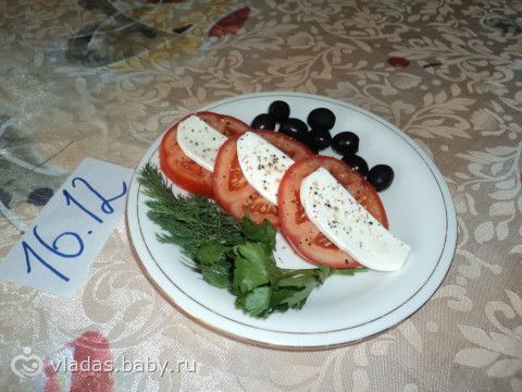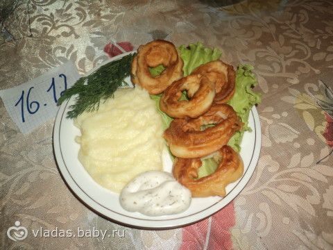 Кольца кальмара в кляре с пюрешкой, то ли салат, то ли закуска… помидоры с сыром фета и приправой, доченьке щи с сухариками и круасанчики с шоколадом