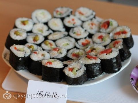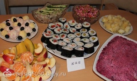 роллы с разными начинками, селедка под шубой, винегрет, салат из капусты с яблоками и брусникой, сырные шарики и картошечка)))