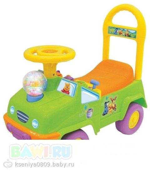 Каталка-пушкар снабжена гудком на руле, а около руля — 4 фигурки героев сказки про Винни Пуха, на каждого можно нажать, и он спрячется в норку. Имеются также 3 музыкальные кнопки, ключ зажигания, рычаг. Нажимая на все это, можно услышать музыку, звук работающего мотора, увидеть, как зажигаются лампочки. Кроме того, на капоте установлен прозрачный шар с колесиком внутри. При нажатии на кнопку бабочка шар начинает светиться, играет музыка.