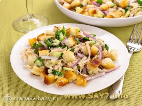 Добавить огурцы, лук, филе, сыр, заправку и сухарики.