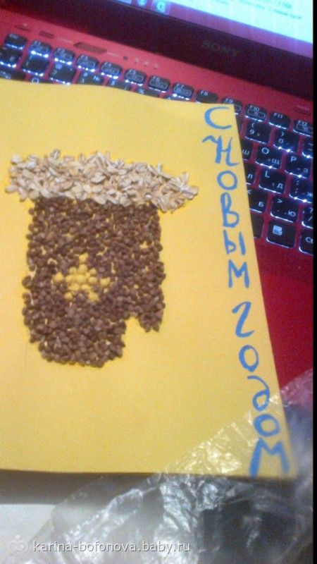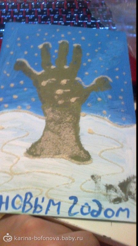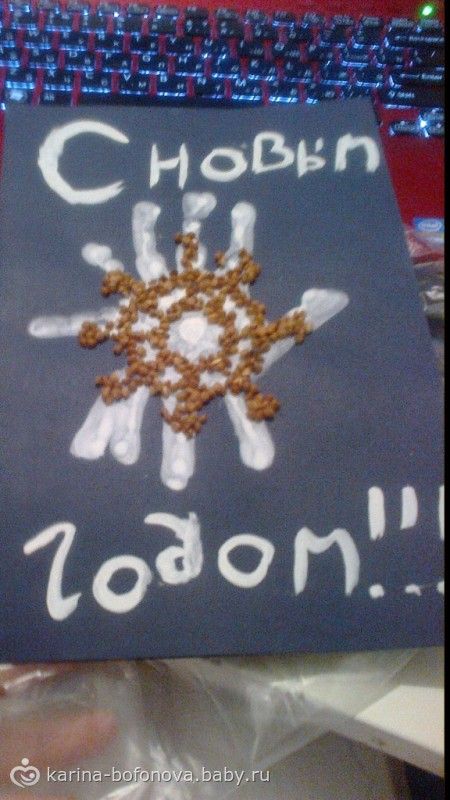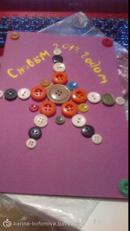 спешу поделиться нашими успехами… делали открытки на новый год… сыну очень понравилось рисовать ладошками)))капать клей, ну и клеить пуговицы и крупу… в общем вот..