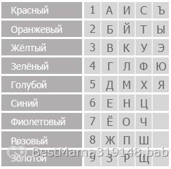 По этой таблице можно определить цвет своего имени и цифру.В ней приведены девять цветов и соответствующие им цифры и буквы. Итак, напиши на листке свое имя. Если число больше 10, складывай цифры до тех пор, пока не получишь число меньше 10. Например, если ты получила число 23, то суммируем следующим образом: 2+3=5. Получаем число 5, соответствующее голубому цвету.