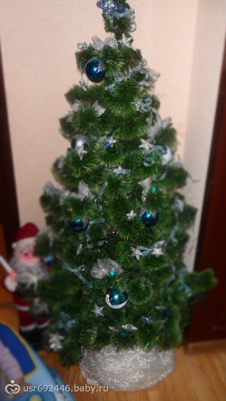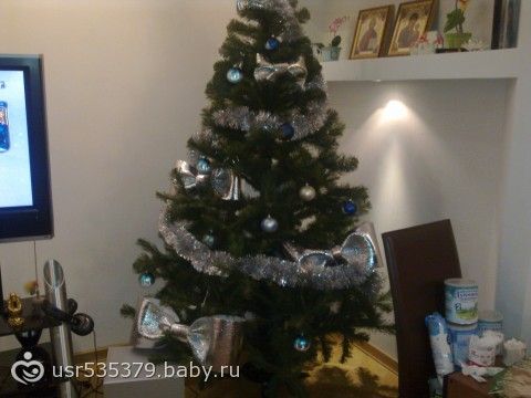 в общем, изначально была задумка сделать все в золотом цвете: золотые шары и банты. но в итоге золотых бантов не нашла таких, какие хотела. смастерила сама банты(дома был кусок утеплителя с одной стороны вот фольга серебристая- поэтому банты получились серебристые. купила кусок золотой парчи, хотела обтянуть их, но в итоге это смотрелось так страшно, что мы решили оставить все-таки банты серебряные.(кстати делается все ооочень быстро), в итоге получилась елка в серебре, а нев золоте. вот набросала то, что дома было(остальные шары или красные или розовые), фонарики завтра повесим. наверно синенькие лучше будут? вот думаю деда мороза со снегуркой под елку ставить или они тут уже лишними будут? и вообще чего еще добавить или убрать? или может шаров других накупить? или нормально так? это пока еще «сырой вариант». ну вот как-то так(не обращайте внимание на стул с хламом- уберем)))