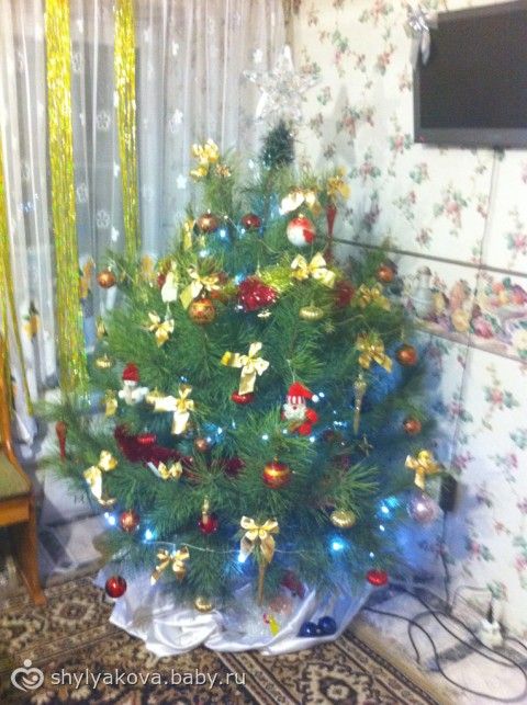 в общем, изначально была задумка сделать все в золотом цвете: золотые шары и банты. но в итоге золотых бантов не нашла таких, какие хотела. смастерила сама банты(дома был кусок утеплителя с одной стороны вот фольга серебристая- поэтому банты получились серебристые. купила кусок золотой парчи, хотела обтянуть их, но в итоге это смотрелось так страшно, что мы решили оставить все-таки банты серебряные.(кстати делается все ооочень быстро), в итоге получилась елка в серебре, а нев золоте. вот набросала то, что дома было(остальные шары или красные или розовые), фонарики завтра повесим. наверно синенькие лучше будут? вот думаю деда мороза со снегуркой под елку ставить или они тут уже лишними будут? и вообще чего еще добавить или убрать? или может шаров других накупить? или нормально так? это пока еще «сырой вариант». ну вот как-то так(не обращайте внимание на стул с хламом- уберем)))