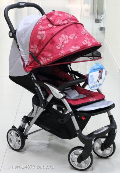 -в такой коляске малыш может уже не только лежать, но и сидеть благодаря регулирующемуся наклону спинки – от горизонтального «лежачего» положения до «сидячего», что значительно увеличивает обзор ребенка.