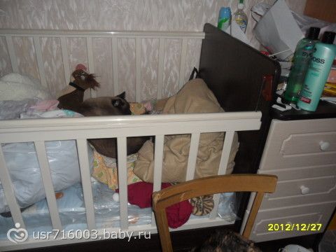 в кроватке не большой бардак, т.к. мама мое покрывало с кровати бросила туда, и там же пакет с детскими вещичками)