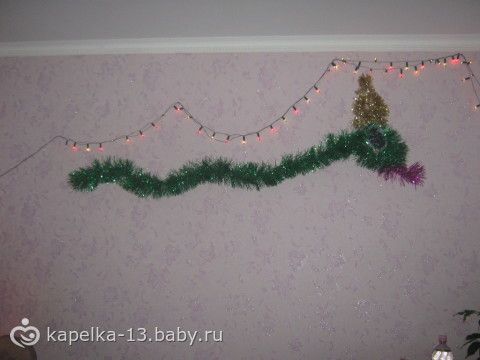 Все игрушки и «гирлянды»крепятся с помощью липучек, звездочка просто одевается на макушку елочки.