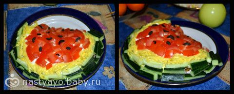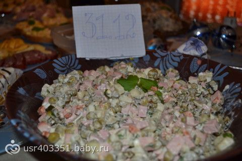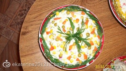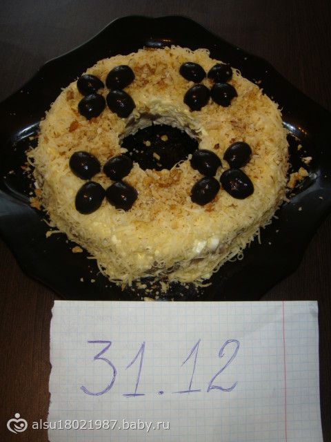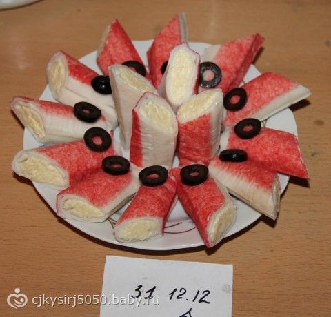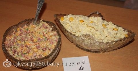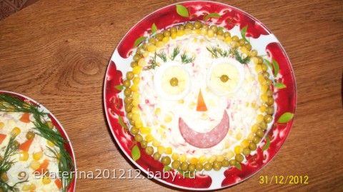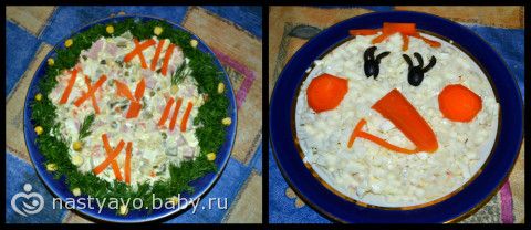 Салат «Снеговик» (крабовый) и «Часы» (оливье)