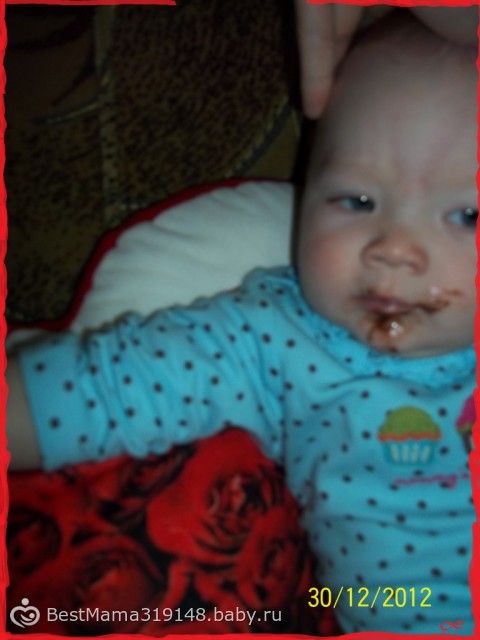 Дочка попробовала шоколад(с тапками мимо)Это получилось Случайно!!! Вырвала она у меня из рук конфету(Трюфельную_Молочную)И начала живать фантик!!! Ну думаю пусть погрызет, а она грызла, грызла.канфета в руке растаяла, она на нее надавила перекладывая с руки в руки и начала есть шоколад!!! Я смотрю, рот весь в шоколаде, руки в шоколаде в общем ВСё и Вся!!! Еле с рук остатки вырвали)))))Всё хорошо закончилось, никакой алергии и диатеза у нас не было)))