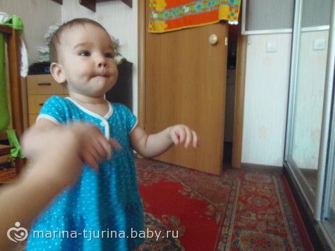 Играть ни во что уже не хочет… ни ладушки, ни сороку, пирамидку не собираемся собирать, глазки и все такое не показываем… то ли не интересно, то ли не понимает что я от нее хочу… Сейчас у нас самая лучшая забава — ходить по комнатам за ручки. Хорошо ходим только за левую ручку, за правую — ножки заплетаются, за обе — можем почти бежать и при этом хихикать)))))