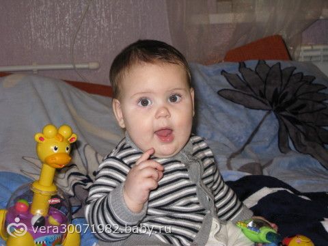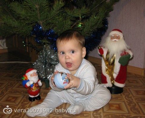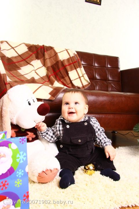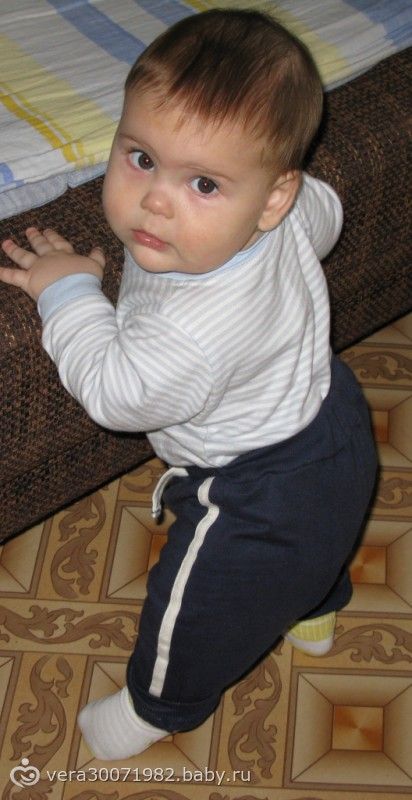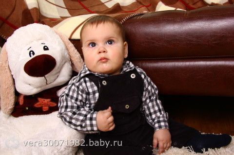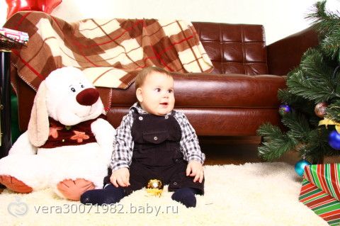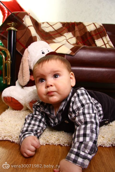 31 декабря нам исполнилось 7 месяцев  . К педиатру попали только 10 января. Взвесились, измерились — выросли мы всего на 1 см, а в весе прибавили 600 гр. — теперь мы 9800 и 69 см. Бутузик мой  . По рекомендации врача стали вводить уже мясное пюре, творог, молочные каши.    Но Ромочка, по-моему, уже готов есть все, что я сама ем    Бедненький так смотрит на меня, когда я кушаю! Один раз я ложкой супчик себе зачерпнула, а он аж ротик свой открыл и так личиком к тарелке потянулся  , аж жалко его стало — мамка ест, а сыну одни овощи, фрукты да кашу сует ))))))). Еще мы начали потихоньку передвигаться в своей кроватке и около дивана, держась за него    А ползаем на четвереньках уже по всей квартире вовсю, только глаз да глаз за ним! Ходили пофоткались с ним в тетр. студию. Вот, посмотрите какие мы большие )))))