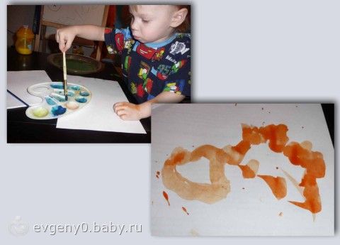 На палитре была синяя краска, Лешка окунул в нее кисточку, стал закрашивать остальные отделения, очень был удивлен, что каждое последующее становилось светлей. После покраски сказал, что синяя краска стала голубой и добавил: «Чудеса какие!». )))