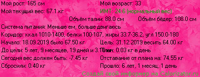 Вес на сегодняшний день 60.4 кг.Замеры будут производится 25 января. Пока скажу только что процент жира в организме упал с 38 до 36 %)))Что не может не радовать))