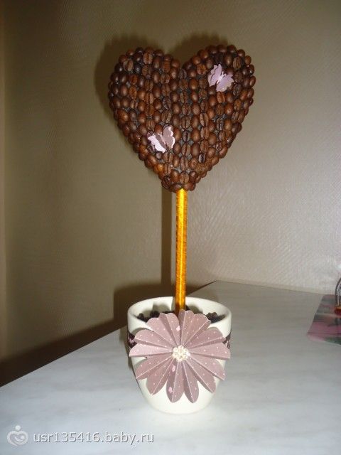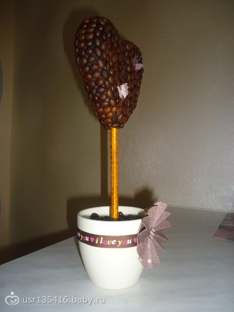 вырезала сердце с пенопласта, обклеивала ватными дисками, красила в черный цвет, в основании делала дырочку.Обклеивала зернами. Палочку обматывала лентой. Всовывала ее в основании сердца. Заливала гипс в горшок и ставила сердце. Остальное все декор на свой вкус