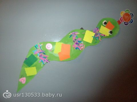 Итак, когда мы туда пришли, в «Семицвете» оказалось все так по домашнему, весь персонал в домашних тапочках, мамочки и детки в носочках, мягкие ковры по всюду-одним словом уютно, я представляла себе это иначе, более официальную обстановку)Люди открытые и радушные)По тому как мы пришли раньше начала нашего занятия нас отвели в комнату для игр, где стоит бассейн с мячиками и горка, Соня так хохотала, катаясь нее, ну и бассейн ребенка тоже впечатлил)Хотя коробки с конструктором, стоящие все в той же комнате, особо ее не тронули)Потм нас позвали в зал, под аккомпонимент пианино мы танцевали, делали зарядку, между делом уча части тела)Мне понравилась игра, где надо было сортировать отдельно банан и апельсин-принципиально разные фрукты)Хорошая игра, делюсь, мы теперь практикуем ее дома: в коробке проделано 2 круглых оверстия, в которые, необходимо закидывать мячики, на занятии был муляж апельсинов, но я придумала немного другой вариант игры-мы теперь дома ракушки в отверстие в крышечке от чая Хипп забрасываем, ребенок так увлечен)А главное развивается мелкая моторика)А еще была интересная забава, на листке формата А3 была нарисована пальма и на ней наклеяны липучки, а дгая половинка липучки крепилась к картонным бананам и детки должны были отцепить бананчик и покормить обезьянку)Соня это дело любит, она унас кормит все игрушки и обнимает их бесконечно)Меня другой раз не поцелует, а мягким друзьям без проблем дарит нежность, и вот в порыве чувств, она покормила и обняла ту обезьянку)Потом мы першли в комнату для творчства(1 час занятия поделен на «зараядку» и творчество), нас встретила уже другая девушка и мы сделали вместе с Соней такую вот змею)Так приятно оставить ее на память)Соня сыпала на нее ленточки мелкие, отрывала 2-х сторонних скотч, что б они прилипли, мазала, под моим руководством, змею клеем и клеяла на нее прямоугольнички)Ну и глазуки почти сама делала)
