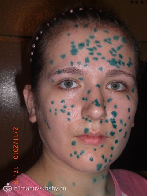 Сынок из садика принес, и мужа заразили… Это было что страшное… Но он все выдержал… Пил водку… Перенес нормально, обсыпало только верхню часть туловища))). А он у нас дятька серьезный, большой начальник… Это надо было видеть как он ходил, потом еще долго весь в зеленки)))