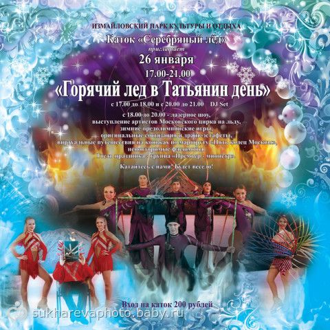 Праздничное действо развернется на катке Серебряный лед, который, по словам организаторов, в этот день обещает стать горячим. Потому что пришедших ждет хоккейный матч, конькобежная эстафета, мегаскоростные катания на «валенках», флешмоб «Олимпийская Змейка» и другие забавы. Чемпионку в спортивных состязаниях будут выявлять среди пришедших на праздник Татьян. Для любителей танцев выступит специально приглашенный DJ, а также группа «ПРЕМЬЕР-МИНИСТР», Московский Цирк на льду и другие популярные артисты. А завершиться праздник лазерным и пиротехническим шоу. Начало в пять вечера. Вход на каток двести рублей, дети до семи лет — бесплатно.