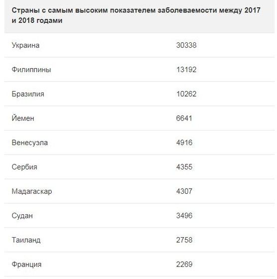 По данным организации, три четверти общего роста заболеваемости корью в 2018 году пришлось на десять стран. В лидерах — Украина: там было зарегистрировано 35 тысяч случаев заболевания. На Филиппинах корью заболели 13 тысяч, в Бразилии — чуть более 10 тысяч.