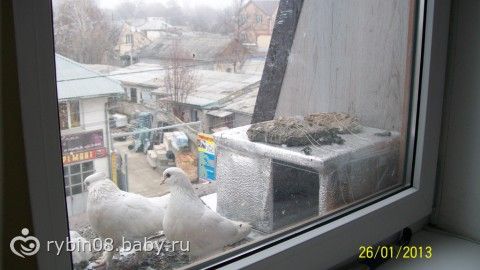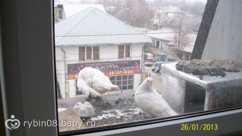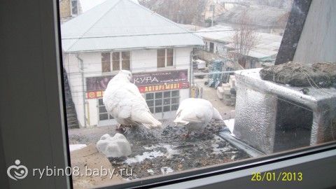 Сегодня в парке увидела мужчину с клеткой белых голубей, прямо как наши. Я его остановила и рассказала что к нам прилетели голуби и живут у нас на поддоконике (с ноября месяца), и хочу что бы он их забрал, так как в голубятне им будет лудше. Он предположил, что скорее всего это его голуби, так как он в ноябре болел и за голубями ему никто не помогал ухаживать и не закрывали клетку, вот они и улетели (либо заблудились). Мне все равно, его это голуби или не его, главное теперь у них будет свой дом, так как у нас им не место. Я посмотрела на его голубей они чистенькие ухоженые, а наши за время скитания, лапки грязные, хвостики уже не белые, они какают на поддаконике, а потом по этим какашкам и ходят, вот и пачкаются, а я задалбалась все время разгрибать их помет. В понедельник обнаружила посредине поддоконика яйцо, выкатилось, наверное с ящика, так я туда положила коробочку с обрезками бумаги. Один голубь погиб, предположительно съели соседские кошки, соседка говорила, что видела под колесами машины белые перья. Так что их осталось двое.
