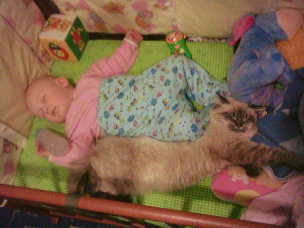 Позавчера всей семьёй решили днём поспать, Пашка и мой папа уснули первыми, потом моя мама спать легла, ну и я не обламываясь тоже)) Кот лёг со мной, но решил перейти как всегда в детскую кроватку. Что было ужасной ошибкой для него) Просыпаюсь от жутких криков кота, поднимаю голову и вижу как сынок зажал кота в углу, держит его одной рукой за ухо, а другой жесточайше бьёт по морде-типа гладит)))) а Марсель у меня молодец, всё терпит от Пашки)