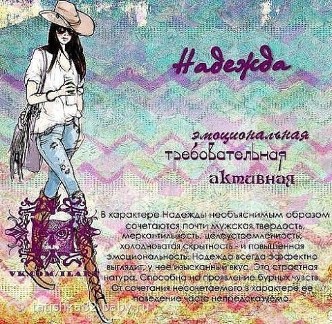 У меня мама Надежда-прям как про неё написано!!! Тведа в решениях-не много скрытна. Про вокальные способности вообще молу- «Журчат ручьи» в её исполнении на кухне или в ванной-это не подрожаемо!!! И про эмоциональность в точку и всегда эффектно выглядит. Вот: