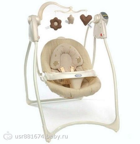 Улетная весчь=)))) Покупали фирмыGRACO как на картинке только 2в1 качели и шезлонг. удобно невероятно, шезлонг можно вынимать и переносить из комнаты в комнату. Не могу сказать, что есть зависимость от покачеваний, уже месяц качаемся. Засыпает в кроватке спокойно. Используем в основном после еды если она спать не желает. Качается, вибрирует, слушает музыку=)