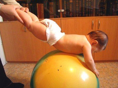 60–70 см яркой расцветки из плотной резины может стать как увлекательной игрушкой, так и оригинальным физическим снарядом для малыша. Достоинствами фитбола являются его компактность (легко сдувается и надувается), легкость и универсальность в использовании, яркая игрушка, мебель, массажный «стол», снаряд и мяч. Занятия с младенцем на фитболе помогают «распрямить ножки», тренируют вестибулярный аппарат, кроме того, это хорошая профилактика заболеваний опорно-двигательной системы. Совсем крохотные тянут головку, оказавшись на шаге, а годовалые «ходуны» уже вовсю сами прыгают на мяч.