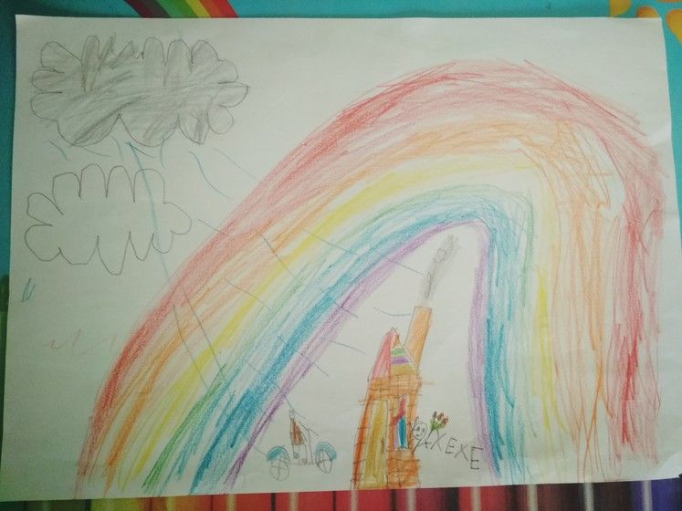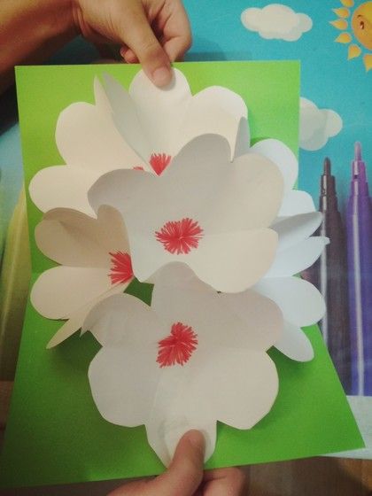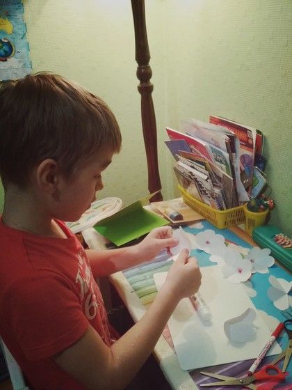 Ведушая очень подробно рассказывала, как и что делать. Украшали все примерно одинаково, символом весны солнце — подсолнух. Муж сказал, что Дима сам придумал смешивать цвета и сделал разноцветные липестки.
