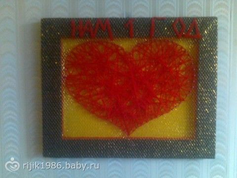 рамку мне мама притащила, а я набила гвоздики в форме сердца и обматала их беспорядочно нитями=)брала толстые для вязания=)