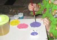 Удобнее всего красить ватные диски пальчиковыми красками, у них очень нежная текстура. Если малыш не любит рисовать пальчиками, можно использовать обыкновенную гуашь и кисточку. Красить ватные диски можно до начала работы, апотом вырезать из них нужные детали, а можно покрасить и уже готовую работу. Только имейте в виду, ватные диски сохнут долго!