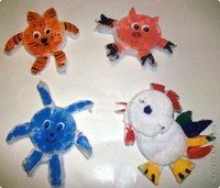 В наших поделках мы в основном использовали третий способ приклейки ватных дисков. Он позволяет видеть ребенку целостность картины.