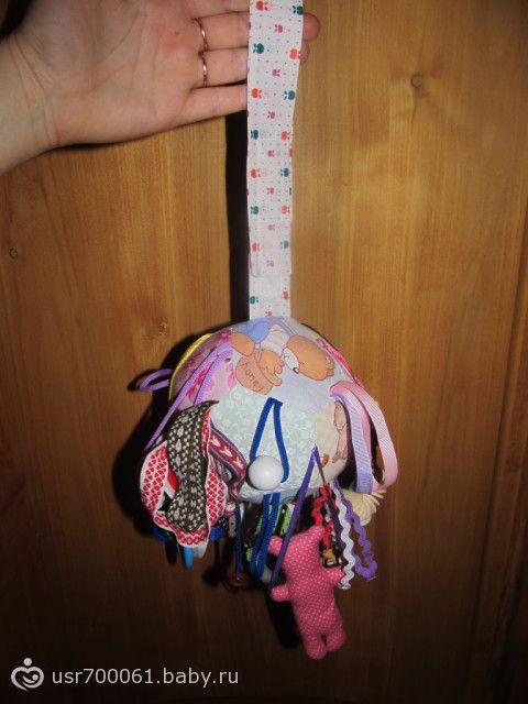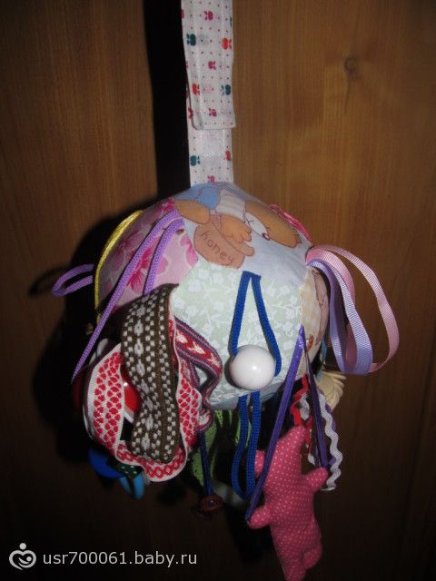 Мячик примерно диаметром 14 см, состоит из 12 пятиугольников и с 30 разными подвесочками, которые гремят друг о дружку) Набит мячик синтепоном