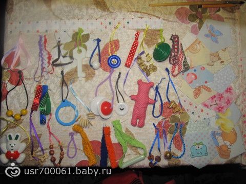 А вот подвесочки поподробней: тут и просто всякие ленточки(вьюнок, атласные, просто шнурочки, вязаное кружево), большие и маленькие фигурные пуговки, бусины, игрушки от детской растяжки на кроватку, также текстильный розовый мишка, у которого в пузе бисер, также есть просто катушка от ниток на хлопковом зеленом кружеве))