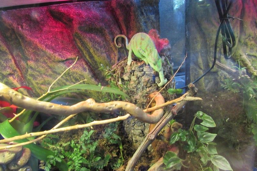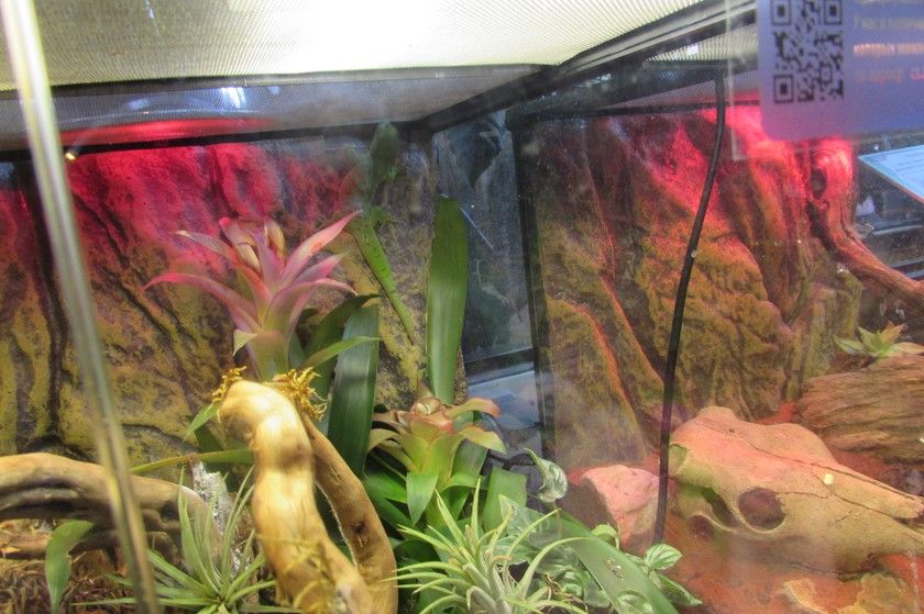 Из новенького — увидели три маленьких террариума с хамеленом, гекконом и какой-то еще закопавшейся в песок ящерицей или змейкой.