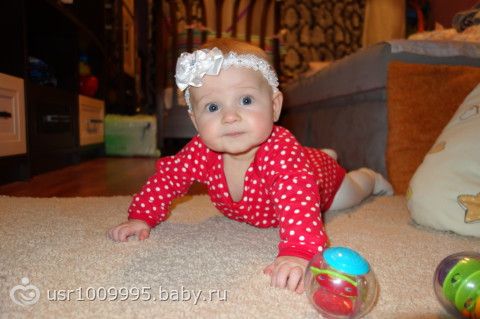 Сидеть и стоять мы еще не умеем, зато умеем вертется во все стороны, перекатываться из одного угла комнаты в другой)) вчера первый раз попробовали покушать брокколи. Зубов у нас тоже пока нет, но они нас очень беспокоят. Учимся спать в своей кроватке, плотно придвинутой к родительской)