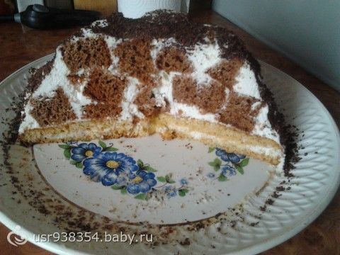 яйца взбить с маслом(размягченым), доб згущёнку-опять взбиваем. добавить муку и соду хорошо размешиваем, делим на 2 части, в 1 доб какао. печём при 180гр 20-25мин. белый корж режем пополам перемазываем кремом(взбить сметану и сахар), а коричневый корж порезала на квадратики, каждый обмакнуть в крем и выложить горкой, сверху полить оставшимся кремом и присыпать тёртым шоколадом(можно глазурью) и в холодильник, через 3-4 часа можно пить чай!!!)))