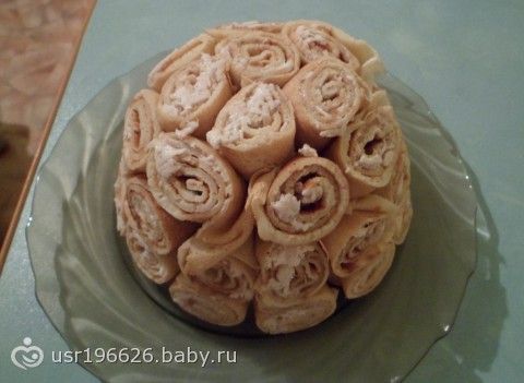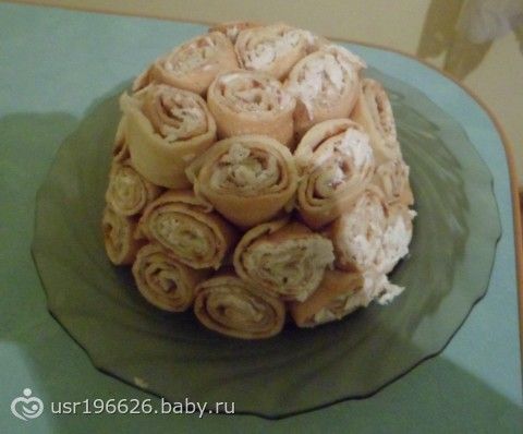 Куриную грудку отварить с солью и специями. Пока грудка варится, сделать тесто для блинов: яйца, муку и крахмал взбить миксером. Испечь блины (должно получиться 8-9 блинов). Отварную грудку разрезать на кусочки или разделить на волокна. Несколько блинов (3-4 шт.) смазать майонезом и выложить на них часть куриного мяса, свернуть трубочками. Блинные рулетики нарезать на колесики по 1 см и выложить их на дно салатника, заранее покрытого пищевой плёнкой. Остальные блины нарезать полосочками и соединить их с остальным мясом грудки и майонезом. Все хорошенько перемешать и выложитьв салатник на блинные «колесики». Перевернуть салат на блюдо и снять с него плёнку.