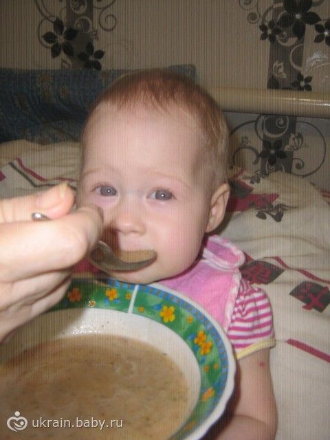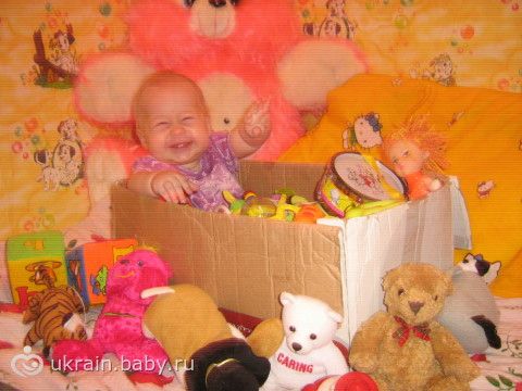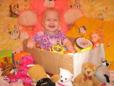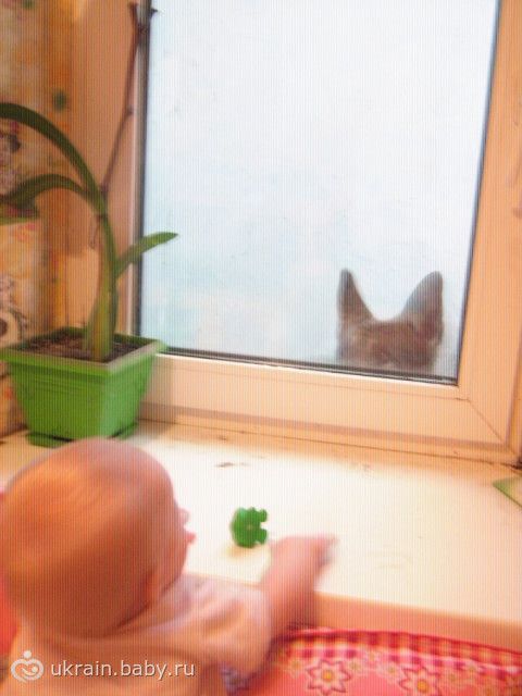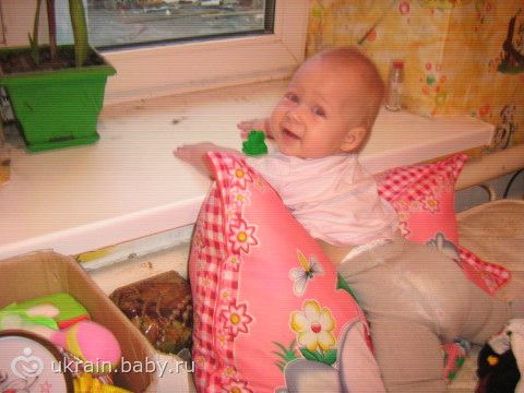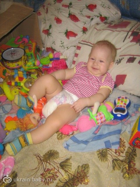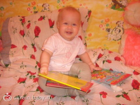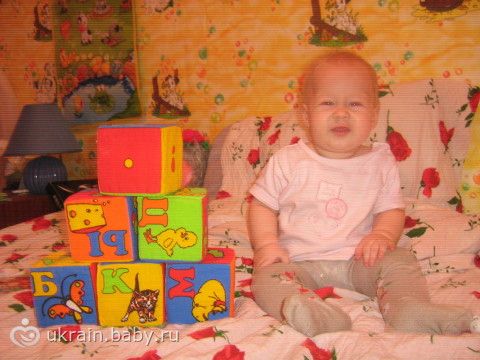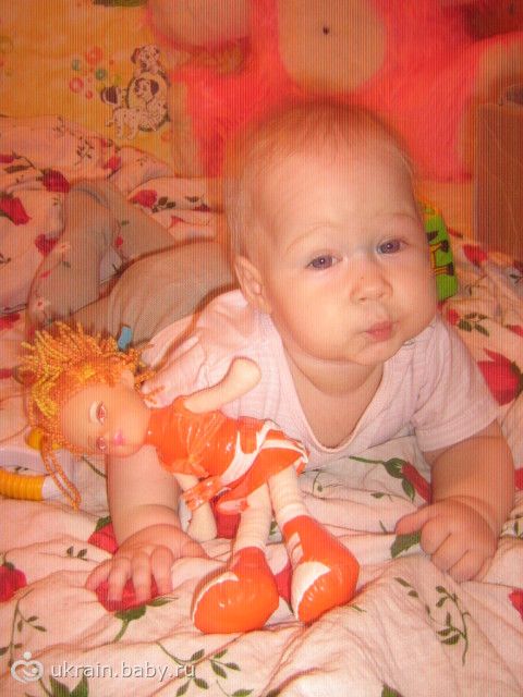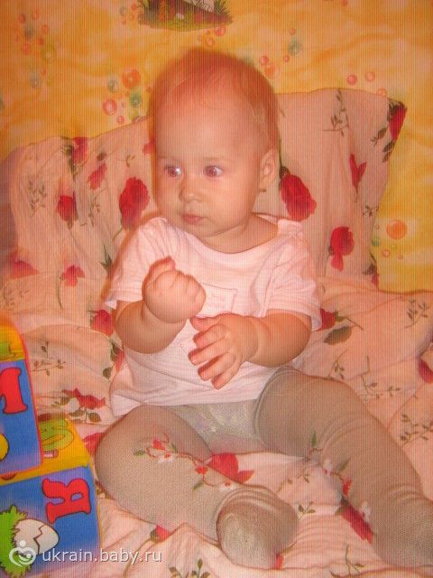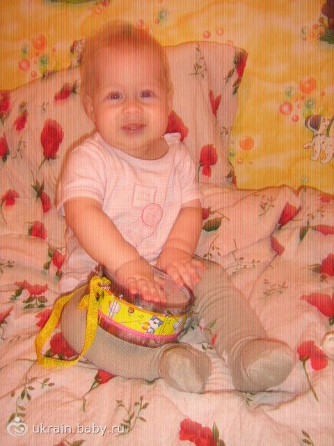 Совсем большая стала бусинка) прикорм есть не хочет- только то что мама и только из маминой тарелки) приходится ее супчики с моей тарелки кормить) Умеет хлопать в ладошки., махать пока-пока, стучать в барабан, показывать пальчиком не-не хотя никто не учил и так не показывал) тянет ручки когда к себе зовешь, ползает на четвереньках через раз, становится на колени держась за опору. Различает несколько животных( показываю наших собак, кота, черепаху и если спрошу где кися- она туда и поворачивается) еще различает некоторые игрушки по названиям, могу поставить 3 разных резиновых зверька, несколько раз повторяю их название и прошу показать например собачку- она к собачке руки и тянет) еще разбирает пирамидку по одному колечку.