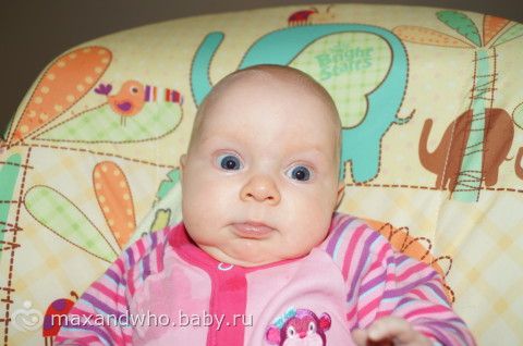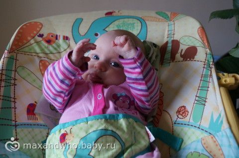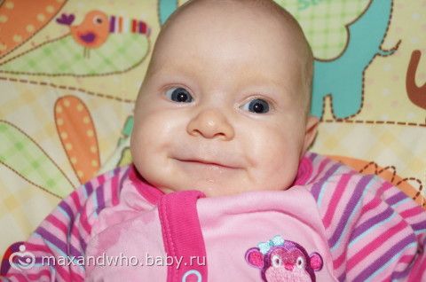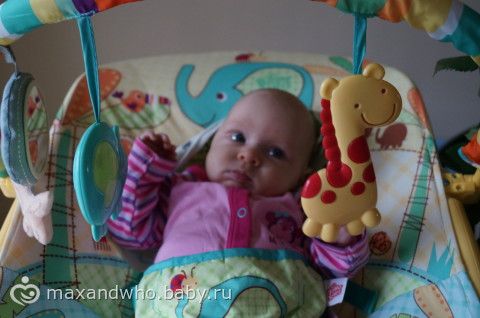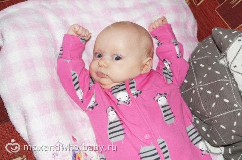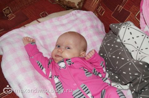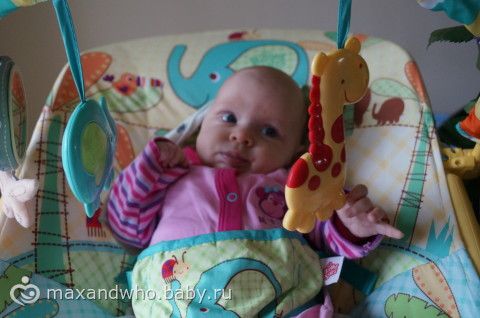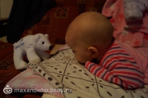 мишка плохо получился, она на него хорошо на коврике смотрит, даже иногда грудку уже приподнимает, на диване упор плохой.
