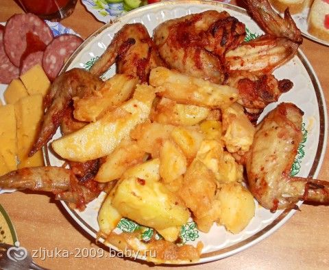 замариновать в кетчупе(который нравится, я в кальве баварский), лук кольцами.два часа мариновать, в духовку на решетку выложить крылышки, под них противень смазанный сливочным маслом с картофелем порезанным на четыре части. очень вкусно!