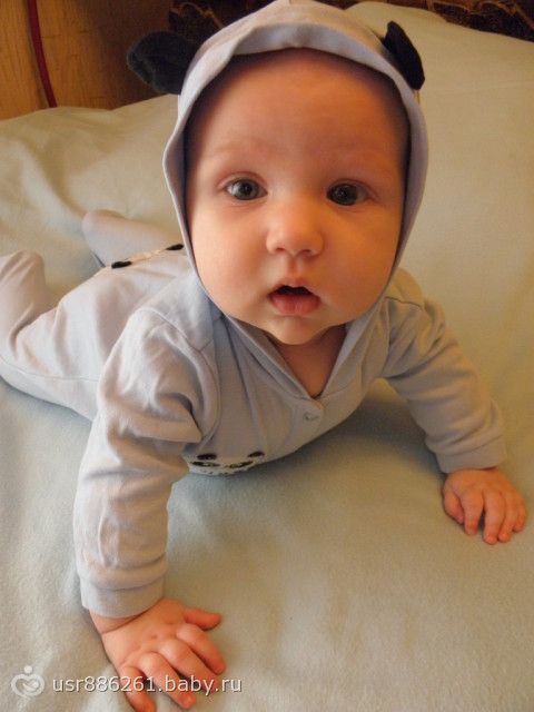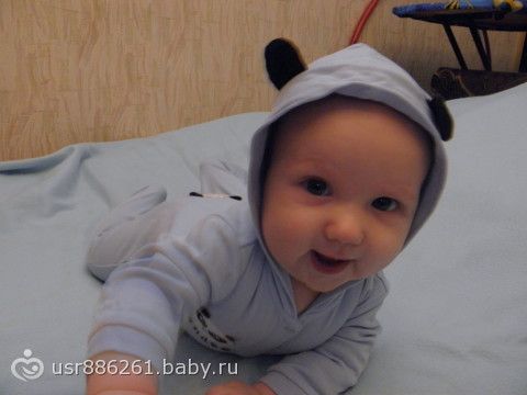 Из достижений: два нижних зуба, очень радуется когда кошка появляется в поле зрения, хватает ее и хочет попробовать)) игрушки берет сам, передает из руки в руку, сам держит бутылочку. Самое важное, что мы научились за этот месяц-вставать на четвереньки и раскачиваться… видимо скоро поползем)))