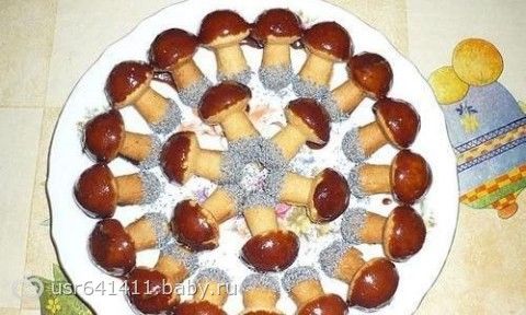 3 яйца, 200 г майонеза и стакан сахара взбить, добавить 1 чайную ложку соды, погашенную уксусом. Все соединить. Форму заполнить с одной стороны. Украсить по желанию.