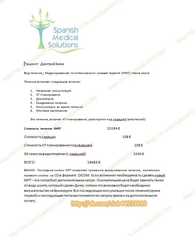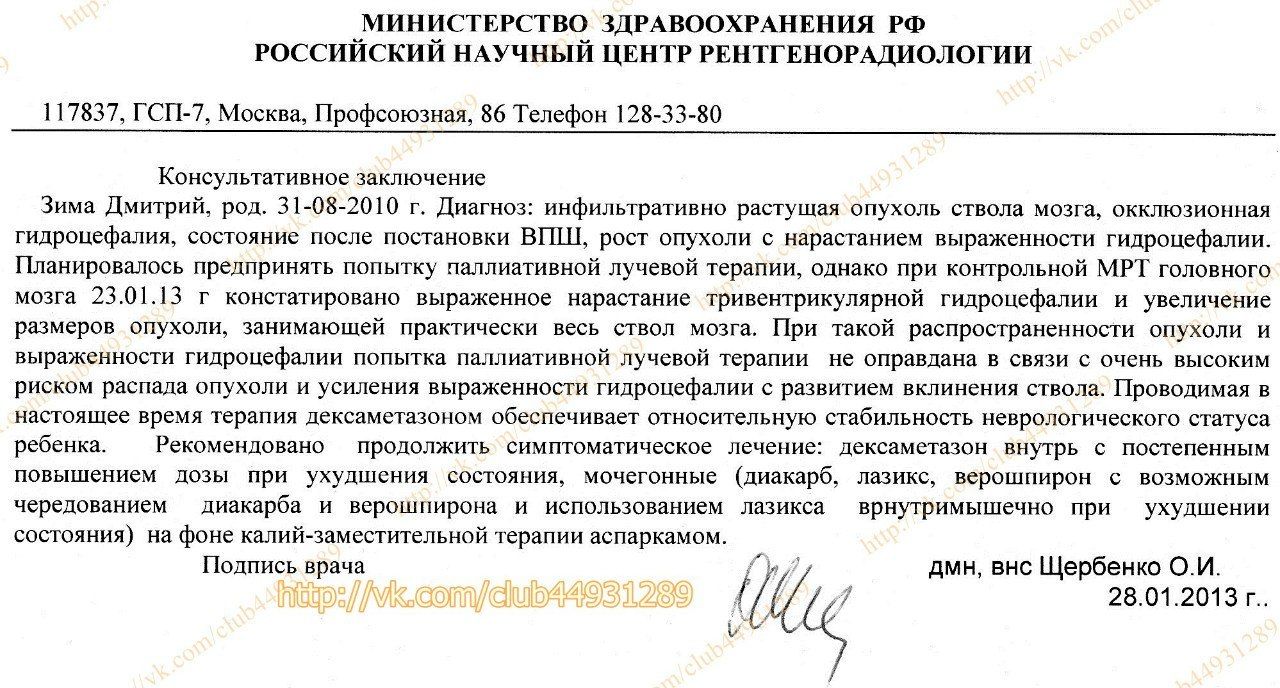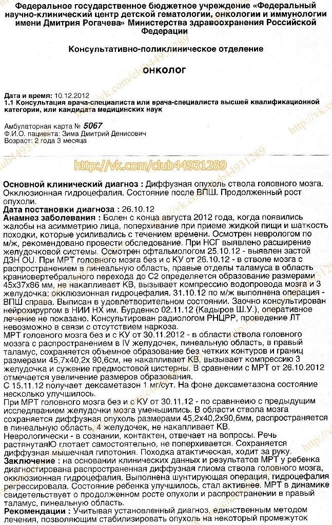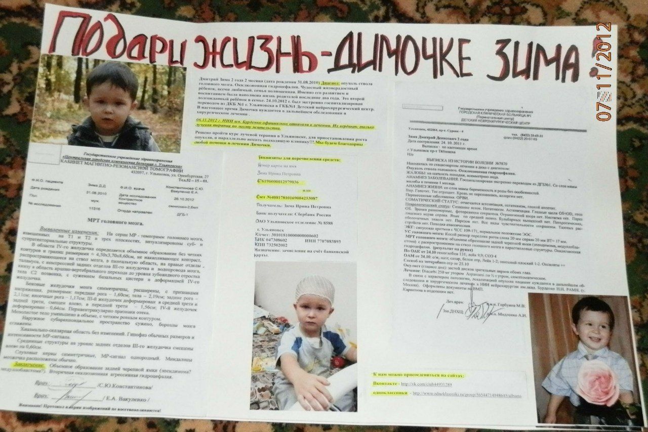 Дмитрий Зима 2 года 5 месяцев дата рождения 31.08.2010) Диагноз: Распространенная диффузная опухоль ствола головного мозга. Окклюзионная гидроцефалия.Состояние после ВПШ. Чудесный жизнерадостный рёбенок, всеми любимый. семья полноценная. Именно его развитием и воспитанием была наполнена жизнь родителей последние два года. Это второй долгожданный ребёнок в семье. 24.10.2012 г. был экстренно госпитализирован переводом из ДКБ №1 г. Ульяновска в ГКБ№1 Детский нейрохирургический центр. В настоящее время Димочка экстренно нуждается в дальнейшем обследовании и лечении, единственная клиника, которая взялась его принять — клиника «БЕНИДОРМ» Испания. На лечение требуется 1 000 000 рублей. Диму ждали в Испании 17 февраля. Денег не собрали. Перенесли лечение на 25 февраля. Это может быть последний шанс. Пожалуйста помогите..