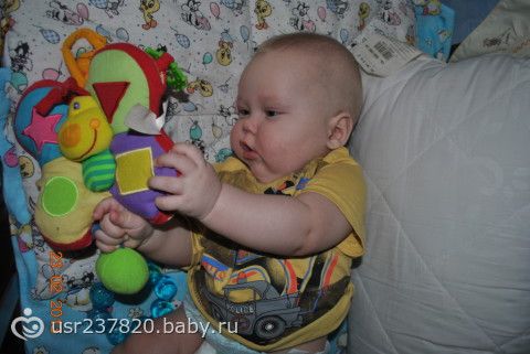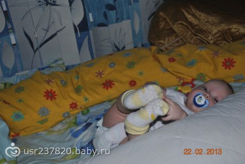 Нашли ноги ))) Сидела за компом, Ярослав спал вроде, слышу смех такой заливистый, поворачиваюсь — тянет себя за ноги и ржет, новая веселая игрушка))) Теперь носки стягивать стало еще проще