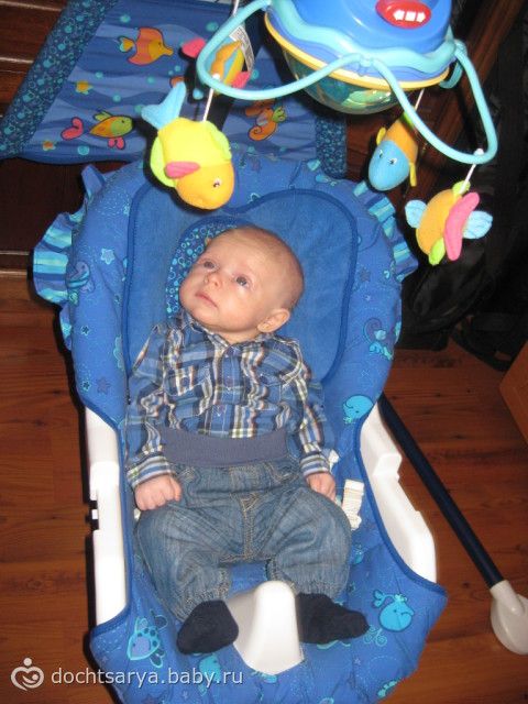 А вчера сынок качался в качельках минут 30 пока я готовила что-то на кухне, а муж был в душе. До этого я уходила из комнаты только если он уже спал или был в сонном состоянии. А оказывается сыночек уже дорос до того, что может сам себя развлекать! Я рада!!!