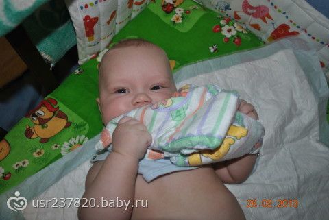 Пока мазала попу кремом, успел схватить памперс и сразу в рот. Попробуй еще отбери.