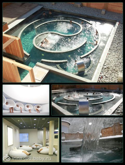 В один из дней мы побывали в термальных источниках. Такая красота! Теплая бурлящая вода под открытым небом, рядом со снежным склоном горы. Куча разных бань, огромных пуфов и кресел под ультрафиолетом, чайная комната с фруктами-сухофруктами и пряными чаями, релакс-комнаты, тренажерный зал, турецкие и финские парные и прочее.