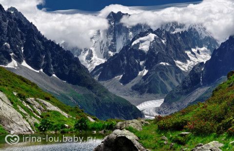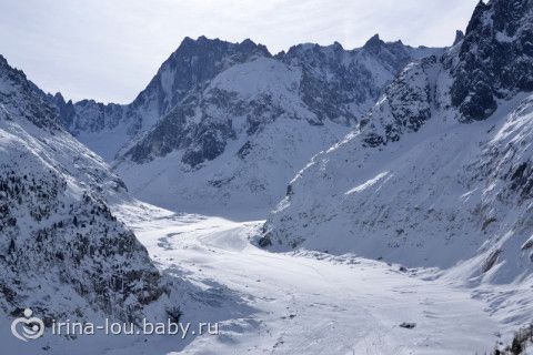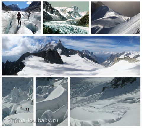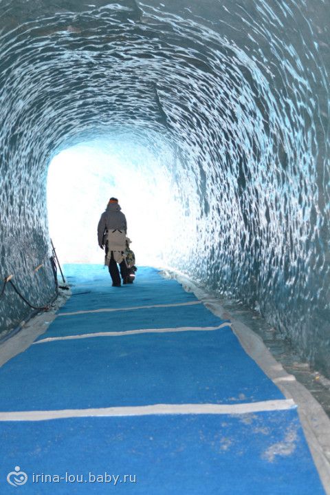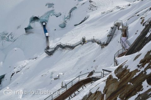 Ездили на паровозике на северный склон массива Монблан к известному леднику Mer de Glas. Это невероятно красиво, у подножия высочайшей вершины Европы целая река льда. К ледяным пещерам вела вот такая лестница