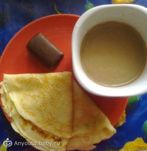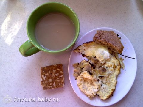 цикорий с молоком, кусочек хлеба, омлет с грибами (подгоревший ) щербет.